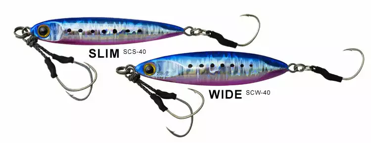 These 30g, 40g & 60gåÊlight jigging metals from Palms are available in both slim and wide configurations. Both are fitted with twin front assist hooks and a single rear assist hook. The Slim version is center balanced and creates a shimmy action on the fall. The wide version is rear weighted and is suitable to use is shallow water. A great lure for shore jigging for kingfish, snapper, trevally, jewfish, tailor flathead and many more species.