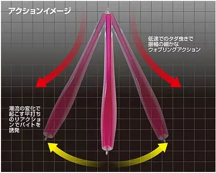 The basic operation is casting and free pulling at low speed. Underwater, it catches the water flow on the side and develops a wobbling action with fine amplitude. Occasionally loses balance or induces a bite with a flat reaction caused by changes in tides.