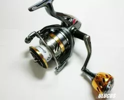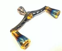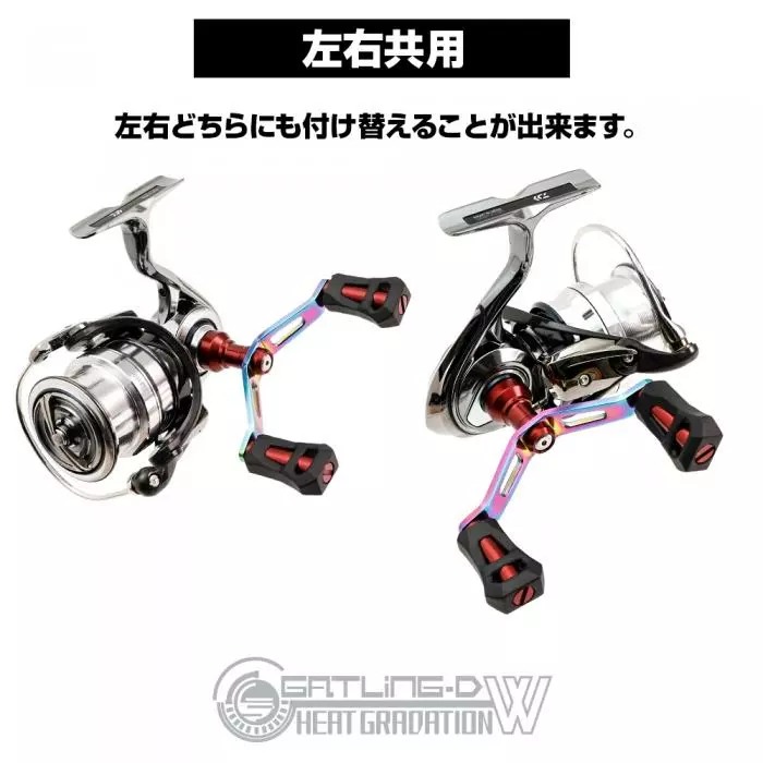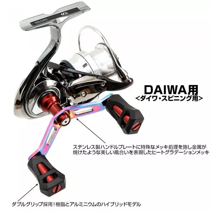 DRESS GATLING W Gatling Double Heat Gradation 90mm [DAIWA] is a dedicated custom handle for Daiwa spinning reels that can be mounted on both left and right side of reel. Made with “heat gradation” colour. The handle plate is a 3 mm thick molded rust resistant stainless steel and is a double handle equipped with a resin grip. This grip is a hybrid model of resin/ aluminum which reduces weight and has the same sensitivity as a metal grip although it is resin
