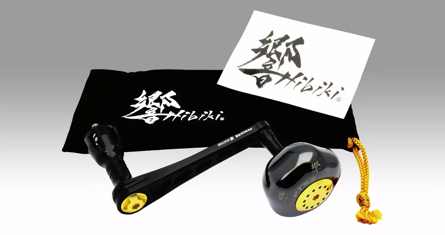 Livre x Hibiki are releasing a limited edition Power Handle suitable for the larger reels size 8000 ~ 20000. The purpose of this development was to create more cranking power and torque through stronger torsional rigidity making it easier to wind the reel and project more power through the reel. The plate, skirt and knob collar are anodised in black, topped off with the centre nut and end cap which are anodised in gold to add a splash of sophistication.Â