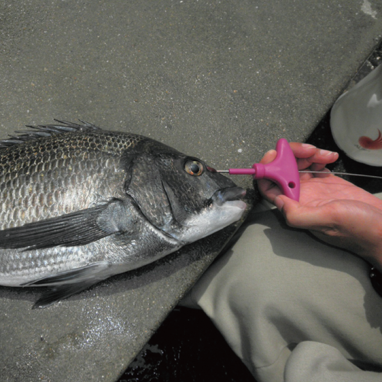 Make a guide hole to the spinal cord by penetrating the hard skull of fish -