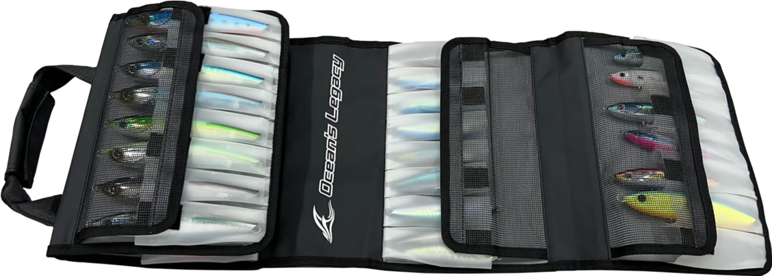 Ocean’s Legacy has solved the issue for transporting hard body lures in boxes which cause them to knock and move around. The new hard body lure soft pouch is a smart system to neatly pack your lures in smooth sleeves to prevent movements and damages. The top flap which closes off the sleeves is mesh to prevent humidity building up and rusting out metal components with a velcro to secure the flap. Finished off with a velcro strap to close the bag and secure handles. Features an additional mesh pocket on the outer side of the bag with Velcro to carry terminals and leaders.
