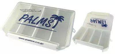 A lure case with a simple Palms logo on a clear polycarbonate lid with high transparency. A simple and tidy method to store your slow jigs which are visible even when the lid is closed. The main body is a white which has a high contrast with the lure. A must for anglers who carry around shore slow jigs that is easy to put in your tackle vest pocket.